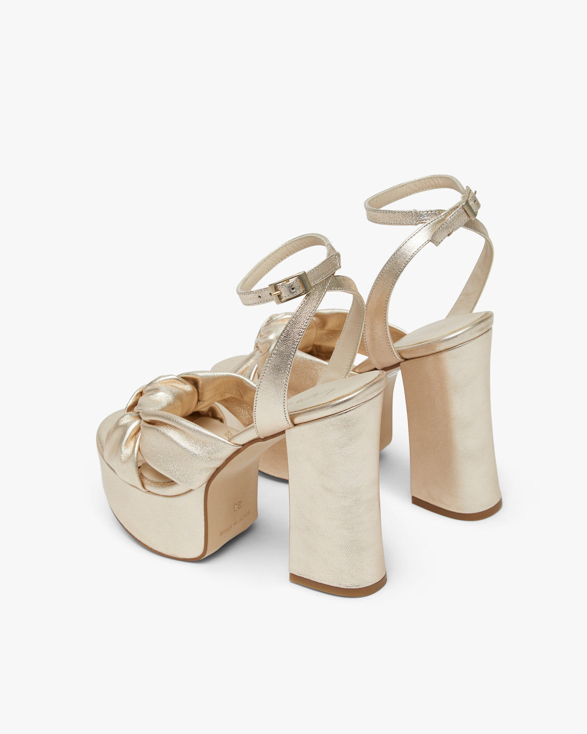 Sandalias de tacón ancho con doble tira con nudo en el centro. Cierre de pulsera con hebilla en el tobillo. Tienen la planta muy acolchada para mayor confort.