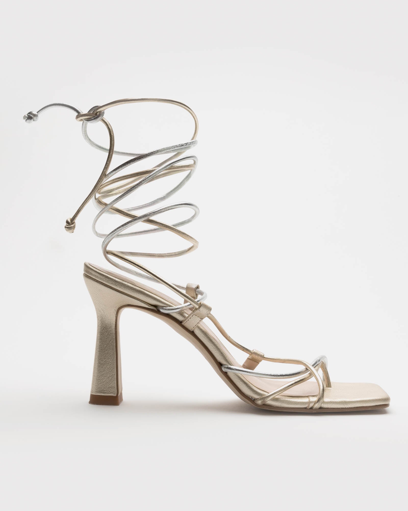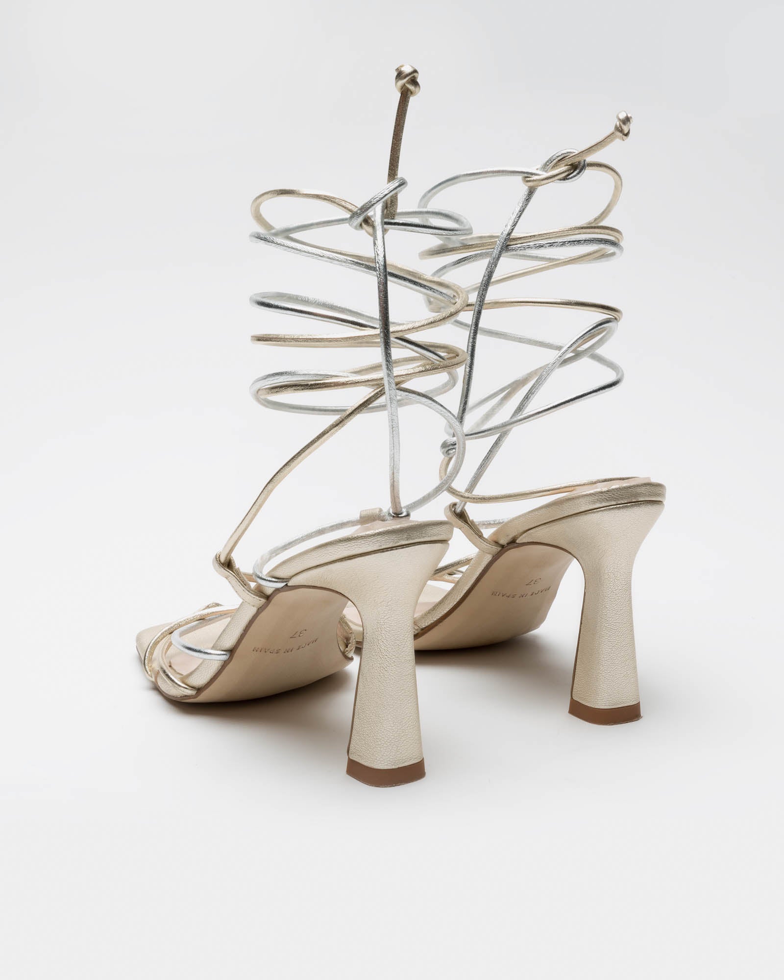 Sandalia de tacón mule y punta cuadrada con tiras tubulares metalizadas en dorado y plateado cruzadas en la parte delantera y posición para el dedo. Cierre mediante tiras atadas en el tobillo. Tiene la planta muy acolchada para mayor confort.